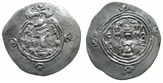 SASANIAN.Khusru ( Husrav ) II Parvis ( The Victorious ) 2nd reign AD 591-628.AR.Drachm. Regnal year 9 ( AD 599 ). mint SML ( uncertain most probably Samarkand ) ( 4.03g, 31.7mm, 3h ). Draped bust of Khusru II right wearing an elaborate winged mural crown with frontal crescent, kolymbos in crescent on right shoulder, crescent on left shoulder, outer circle star and crescent at 9,3 and 6 o'clock Reverse.Fire altar with ribbons flanked with a star and crescent, attendant either side, mint signature to right and regnal year, outer circle star and crescent at 9, 12, 3 and 6 o'clock. Ref:Gobl type II/3. Good very fine, some flat areas in strike. |