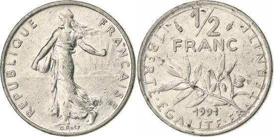 | | France, 1/2 Franc, Semeuse, 1991, Paris, Nickel, , Gadoury:429 | | | Semeuse, The Seed Sower, Laurel divides denomination and date, Without mint mark. | | FEATURES |