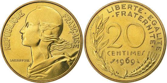 | | France, 20 Centimes, Marianne, 1969, Paris, FDC, Aluminum-Bronze, | | | Marianne, Liberty bust left, Denomination above date, grain sprig below, laurel branch at left, Without mint mark. 1991-1993 dated coins, non-Proof, exist in both coin and medal alignment., Henri Lagriffoul | | FEATURES |
