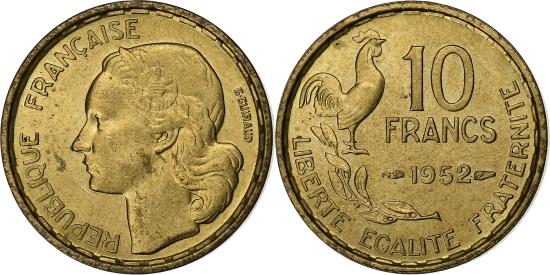 | | France, 10 Francs, Guiraud, 1952, Paris, Aluminum-Bronze, , KM:915.1 | | | Guiraud, Head left, Denomination above date at right, rooster above laurel leaves at left, Without mint mark. | | FEATURES |