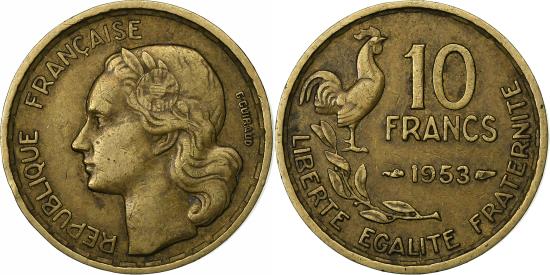 | | France, 10 Francs, Guiraud, 1953, Paris, Aluminum-Bronze, , KM:915.1 | | | Guiraud, Head left, Denomination above date at right, rooster above laurel leaves at left, Without mint mark. | | FEATURES |