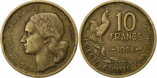 | | France, 10 Francs, Guiraud, 1951, Paris, Aluminum-Bronze, , KM:915.1 | | | Guiraud, Head left, Denomination above date at right, rooster above laurel leaves at left, Without mint mark. | | FEATURES |