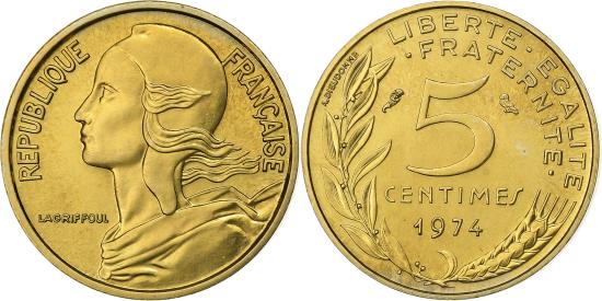 | | Coin, France, Marianne, 5 Centimes, 1974, Paris, , Aluminum-Bronze | | | Marianne, Liberty bust left, Denomination above date, grain sprig below, laurel branch at left, 1991-1993 dated coins, non-Proof exist in both coin and medal alignment., Henri Lagriffoul | | FEATURES |