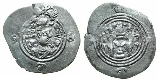 SASANIAN.Khusru ( Husrav ) II Parvis ( The Victorious ) 2nd reign AD 591-628.AR.Drachm. Regnal year 9 ( AD 599 ). mint LAM (Pprobably Ram-Ohrmadz, Khuzistan ) ( 4.12g, 33.3mm, 3h ). Draped bust of Khusru II right wearing an elaborate winged mural crown with frontal crescent, kolymbos in crescent on right shoulder, crescent on left shoulder, outer circle star and crescent at 9,3 and 6 o'clock Reverse.Fire altar with ribbons flanked with a star and crescent, attendant either side, mint signature to right and regnal year, outer circle star and crescent at 9, 12, 3 and 6 o'clock. Ref:Gobl type II/3. Good very fine, flat areas in strike, two tiny edge splits. |