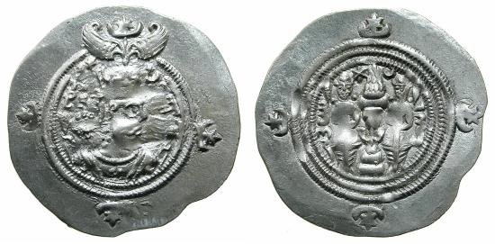 SASANIAN.Khusru ( Husrav ) II Parvis ( The Victorious ) 2nd reign AD 591-628.AR.Drachm. Regnal year 11 ( AD 601 ). mint WYHC (unknown location) ( 4.14g, 32.4mm, 3h ). Draped bust of Khusru II right wearing an elaborate winged mural crown with frontal crescent, kolymbos in crescent on right shoulder, crescent on left shoulder, outer circle star and crescent at 9,3 and 6 o'clock Reverse.Fire altar with ribbons flanked with a star and crescent, attendant either side, mint signature to right and regnal year, outer circle star and crescent at 9, 12, 3 and 6 o'clock. Ref:Gobl type II/3. Good very fine, some flat areas in strike. Most Sasanian mint attributions are problematic, the mint signature WYHC is a major mint yet the location has not been firmly established. Many locations have been proposed Veh-az-Amid-Kavad, Fars, Veh-Ardaxsir, Southern Iraq, Media and Nishapur are among the candidates proposed. |