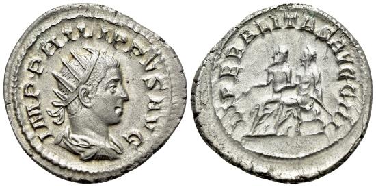 Philip II (247-249). AR Antoninianus. Rome, 247-9. R/ Philip I and Philip II seated on curule chair.