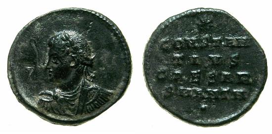ROMAN.Constantius II as Caesar AD 337-347.AE.Follis.mint of ANTIOCH, officina A.Struck Circa AD 324/325. ( 2.64g, 16.9mm, 6h ) Anepigraphic, bust left of Constantius II. Reverse.* / CONSTAN / TIVS / CAESAR / SMANTA / . Ref:RIC VII.60 Good very fine, light scrape before bust and light hairline scratch behind head, dark glossy patina. Struck circa 324/325 as Caesar under his father Constantine I The Great AD 307-337. Coin not photogenic, more pleasing to the eye in hand. |