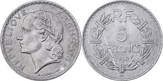| | France, 5 Francs, Lavrillier, 1950, Beaumont - Le Roger, Aluminum, | | | Lavrillier, Laureate head left, Denomination above date within sectioned wreath | | FEATURES |