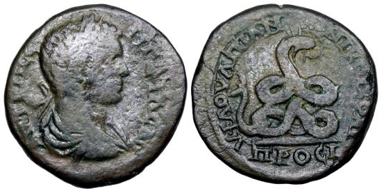 Y FL OYLPIAN NIKOPOLI PROC I, coiled serpent (Glykon) with forked tail and nimbate head right.