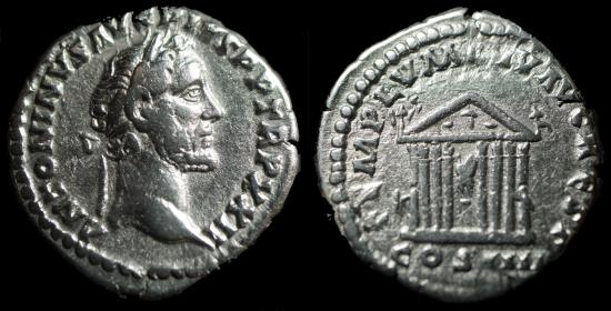 ANTONINVS AVG – PIVS PP TR P XXII Laureate head r. Rev. TEMPLVM DIV AVG REST Octastyle temple, adorned with four statues and a quadriga, within which, seated statues of divine Augustus and Livia. In exergue, COS IIII.