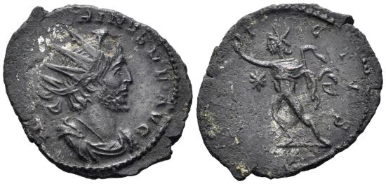 Victorinus. 269-271 AD. AE Antoninianus (2.81g, 23mm). Colonia Agrippinensis mint. Struck 270 AD. Obv.: [IMP C VICTO]RINVS P F AVG, radiate, draped and cuirassed bust right. Rev. [INV]ICTVS, Sol advancing left, holding whip and raising hand; on left field, star. RIC 114; Elmer 683. Traces of silvering flan flaw on obverse, VF. |