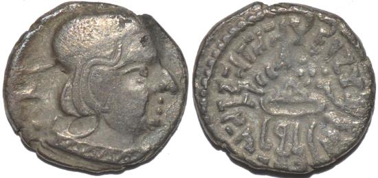 Crescented three-arched hill (chaitya), river below, crescent moon at left, sun at right, Brahmi legend around (at 11:30, clockwise): Swami Jivadamaputrasa Rajna Kshatrapasa Rudrasihasah |
