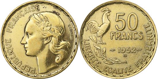 | | France, 50 Francs, Guiraud, 1952, Beaumont - Le Roger, Aluminum-Bronze | | | Guiraud, Head left, Rooster above laurel, denomination at right | | FEATURES |