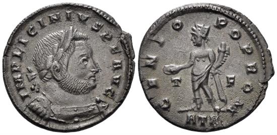 Licinius I. 308-324 AD. AE Follis (2.80g, 20mm). Treveri mint. Struck 313-5 AD. Obv.: IMP LICINIVS P F AVG, laureate and cuirassed bust right. Rev.: GENIO POP ROM/ T-F, Genius standing left, holding patera and cornucopiae; ATR in exergue RIC 58. gVF.