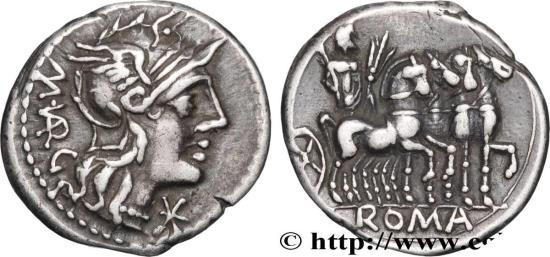 ROMA à lexergue Jupiter, nu debout dans un quadrige au pas à droite, tenant une branche de la main droite, les rênes et un foudre de la main gauche