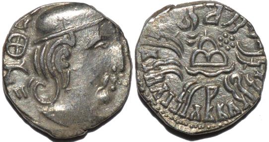 After the gap of 16 years from S. 254-270 (336-348 CE), a king ascended the Kshatrapa throne again in 270. Rudrasena III names his father Mahakshatrapa Swami Rudradaman, but no such ruler issued coins, so it is not clear if he indeed was a mahakshatrapa. It is quite possible that the descendants of Yasodaman II continued the fiction of kingship and retained their titles, even as they were driven from power and thereby lost the ability to issue coins. In that case, the ascent of Rudrasena III would amount to a restoration. Although Rudrasena enjoyed a long reign, as he issued coins from 270 to 300, it must have been marked by strife. There are no coins known for the years 276-79, so it appears he was driven from the throne for about 5 years in that period. Once he returned, however, the series is continuous until 300. Nice portrait and a clear date and legend ... a CHOICE specimen! |