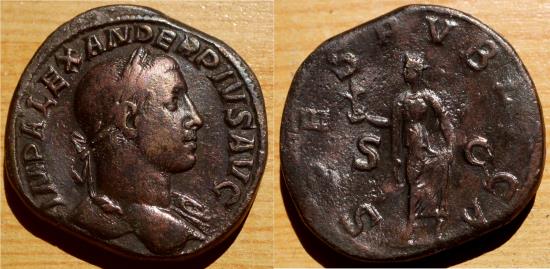 IMP ALEXAN-DER PIVS AVG Laureate, draped, cuirassed bust r. Rev. SPES P-VBLICA / S-C Spes advancing l., holding flower in her raised r. hand, raising skirt with her l. hand.
