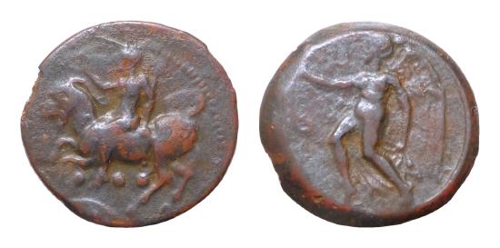 | Sicily, Himera Æ 14mm 1,8g Tetras. 420 BC. Nude youth riding goat left, blowing conch shell, below three pellets and grain of wheat / IMEPAION, Nike to left holding aphlaston. CNS I, n. 42; SNG Copenhagen -; SNG ANS 1339.Good Very Fine. |