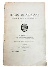 L. Forrer: Benedetto Pistrucci. Italian Medallist & Gem-Engraver 1784-1855, London, 1906, 40 pages, well illustrated throughout the text, paper wrappers loose, internally clean and Fine. An extract from the author’s “Biographical Dictionary of Medalists,”