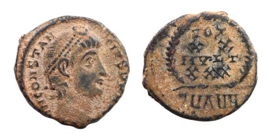 Constantius II 337-361 AD AE 15 mm. 2.0 gm. Obv: D N CONSTANTIVS P F AVG ; Pearl diademed draped and cuirassed bust right. Rev: VOT XX MVLT XXX within wreath. Unrecorded mint mark below. Rare.
