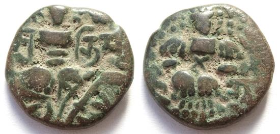 Hindu rajas of Kashmir Abhimanyu (ruled 958-972 AD) AE stater (6.2 g) Obverse: Goddess Lakshmi seated facing, with Nagari legends Abhi/ma(nyu Gu) Reverse: King standing sacrificing at altar, with Nagari legend pta to right Ref: Michael Mitchiner, Non-Islamic States & Western Colonies (AD 600-1979), 173 Abhimanyu was the infant son of King Kshemagupta. His father's death made him ruler at a young age with his mother Didda as regent. He ruled for fourteen years but was ultimately murdered by Didda. Rare. |