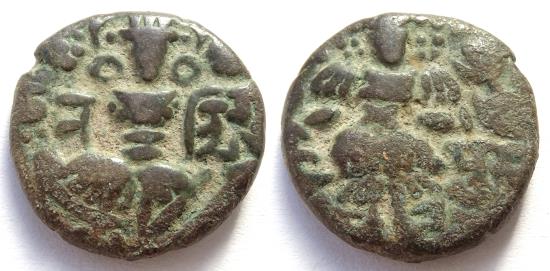 Hindu rajas of Kashmir Nandi Gupta (ruled 972-973 AD) AE stater (6.2 g) Obverse: Goddess Lakshmi seated facing, flanked by Nagari legends Na/ndigu Reverse: King standing sacrificing at altar, with Nagari legend pta to right Ref: MNI 174/176 Nandi Gupta ruled for only two years. His coins are very hard to find. RR. |