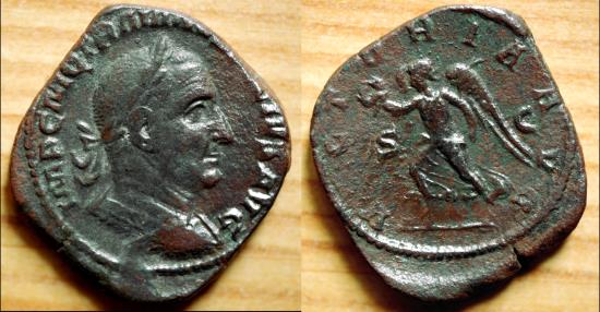 IMP C M Q TRAIANVS DECIVS AVG Laureate and cuirassed bust r. Rev. VICTORIA AVG S – C Victory striding l., holding wreath and palm branch.