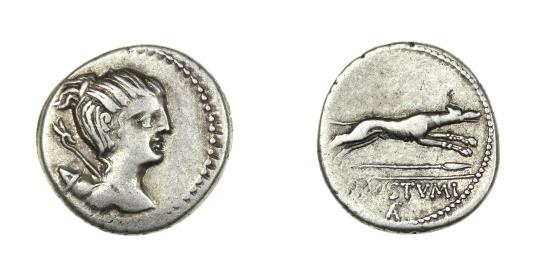 Draped bust of Diana. Bow and quiver over shoulder / Hound running right. Spear below