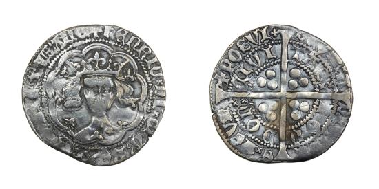Henry V Silver Groat 1413-1422AD Light coinage. Facing bust crowned/ Long cross with 3 pellets in each angle. 25x26mm, 3.78g Henry V is perhaps England’s most famous warrior king and was immortalised by Shakespeare for his victory over the French at Agincourt. Henry as Duke of Monmouth was increasingly involved in the affairs of state as his father Henry IV became increasingly ill from about the middle of his reign. As a young man Henry V was injured by an arrow at the Battle of Shrewsbury and all his subsequent portraits show only the left side of his face. Civil Wars in France gave Henry IV the chance to re ignite the Hundred Years war and 2 expeditions were launched against France in AD 1411/1412. In AD 1415 Henry led another expedition to France capturing Harfleur. Against advice he decided to march back to Calais. It was on St Crispin’s Day, 25th October that he came up against the much larger French army. Deciding on battle he succeeded in routing the French force and winning one of the most famous victories in England’s history. Returning for a second campaign he stormed across northern France capturing Rouen in AD 1419 and eventually Paris. Peace was negotiated at the Treaty of Troyes in AD 1420 whereby Henry was recognised as King of France after the death of the French king Charles VI. Unfortunately Henry died suddenly in AD 1422 shortly before Charles VI and before he could be crowned in Paris. |