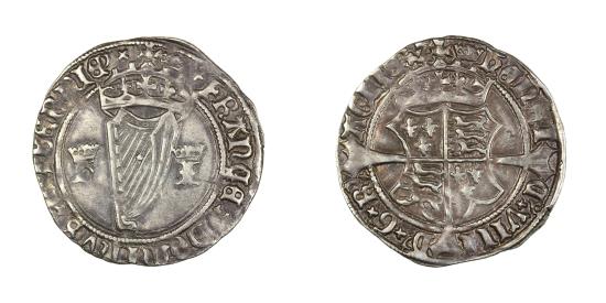 Ireland Henry VIII 1509-1547AD Silver Groat First Harp Issue. 1534-40AD Crowned arms / Crowned harp. H-I to either side, Jane Seymour. 1536-7 AD S6473, 24mm, 2.63g Henry VIII AD 1509-1547 Henry VIII was the second son of Henry VII and before becoming king had considered an ecclesiastical career. He is largely remembered for his break with Rome, the dissolution of the monasteries and for having 6 wives. He is also remembered for his de basement of the currency which helped finance his wars with France and Scotland. By the time of the 3rd Issue some of the coinage contained so little silver that the copper alloy underneath was revealed. This earnt Henry the nickname Old Coppernose. |