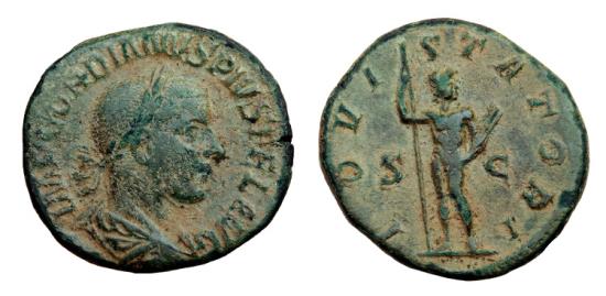 C. 241-243 AD Reverse: IOVI STATORI, S C across field, Jupiter standing right, holding sceptre and thunderbolt. Slight pitted surfaces to obverse with some earthy surface deposits and good detail. Provenance: Ex Nash Collection, collected in the 1990's to 2000's. Ref: RIC IV 298a Weight: 17.39g Size: 30mm |