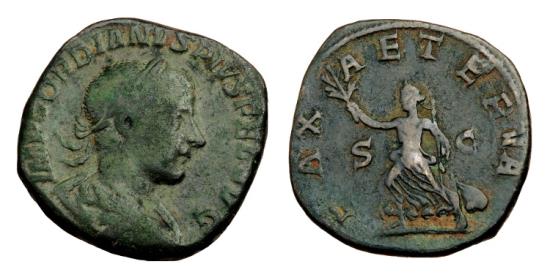 C. 241-244 AD Reverse: PAX AETERNA, Pax advancing to left, holding branch and sceptre, S-C across fields. Slight grainy surfaces to obverse with some earthy surface deposits and good detail. Provenance: Ex Nash Collection, collected in the 1990's to 2000's. Ref: RIC IV 319 Weight: 20.17g Size: 30mm |
