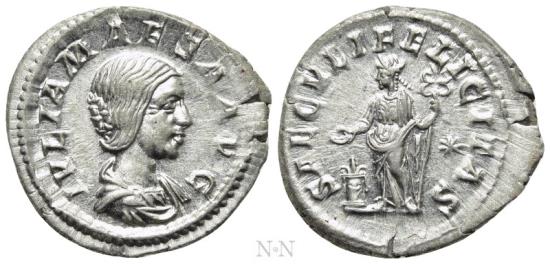 Obv: IVLIA MAESA AVG.Draped bust right.Rev: SAECVLI FELICITAS.Felicitas standing left, holding caduceus and patera over lighted and garlanded altar to left; star to right.