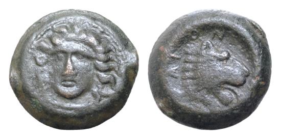 Thessaly. Pherae 404-369 BC. Trichalkon Æ21mm., 9g. Head of nymph facing slightly left / , water fountain right in the form of lion's head .