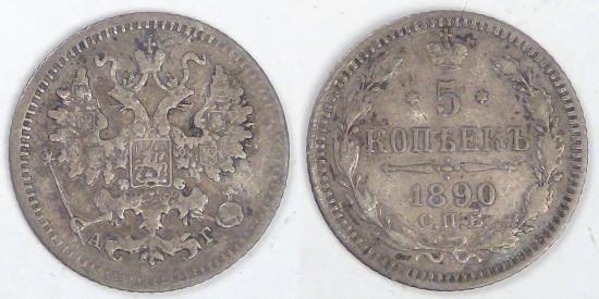 RUSSIA - Empire, Alexander III, 1890 СПБ АГ, 5 Kopeks, Very Fine