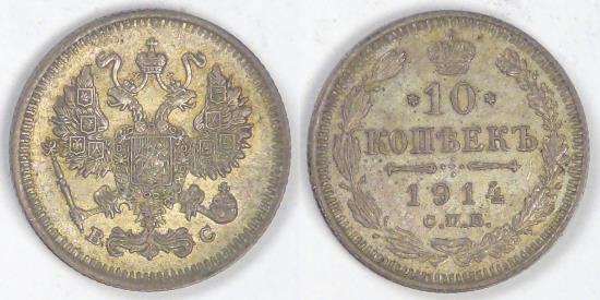 RUSSIA - Empire, Nicholas II, 1914 СПБ BC, 10 Kopeks, Choice Almost Uncirculated