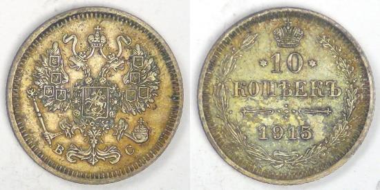 RUSSIA - Empire, Nicholas II, 1915 СПБ BC, 10 Kopeks, Almost Uncirculated
