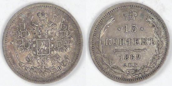 RUSSIA - Empire, Alexander II, 1862 СПБ МИ, 15 Kopeks, Choice Extra Fine