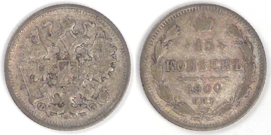 RUSSIA - Empire, Nicholas II, 1900 СПБ ФЗ, 15 Kopeks, Very Fine