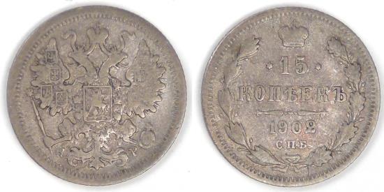 RUSSIA - Empire, Nicholas II, 1902 СПБ AP, 15 Kopeks, Very Fine
