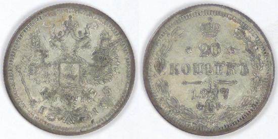 RUSSIA - Empire, Alexander II, 1877 СПБ НI, 20 Kopeks, Extra Fine