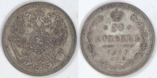 RUSSIA - Empire, Nicholas II, 1910 СПБ ЗБ, 20 Kopeks, Choice Very Fine
