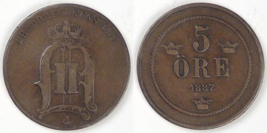 SWEDEN, Oscar II, 1887, 5 Öre, Fine+