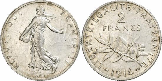 | | Coin, France, Semeuse, 2 Francs, 1914, Paris, AU(55-58), Silver, KM:845.1 | | | Date above an olive branch, Sower walking and sowing against the wind; behind the rising sun, LIBERTE EGALITE FRATERNITE, REPUBLIQUE FRANÇAISE | | FEATURES |