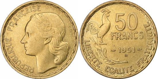 | | France, 50 Francs, Guiraud, 1951, Beaumont - Le Roger, Aluminum-Bronze | | | Guiraud, Head left, Rooster above laurel, denomination at right | | FEATURES |
