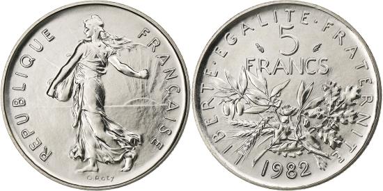 | | France, 5 Francs, Semeuse, 1982, Paris, Nickel Clad Copper-Nickel, | | | Semeuse, The Seed Sower, Branches divide denomination and date | | FEATURES |