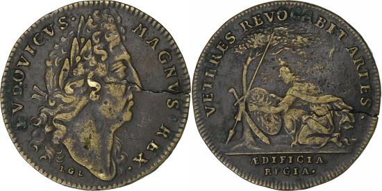 | | France, Token, Louis XIV, Bâtiments du Roi, Brass, , Feuardent:3059 | | | Laureated bust right, Pallas kneeling left, in front of a military trophy, LVDOVICVS. MAGNVS. REX, VETERES. REVOCABIT. ARTES. A l'exergue : AEDIFICIA REGIA | | FEATURES |
