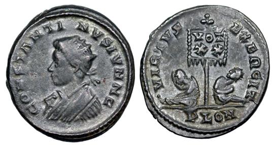 Constantine II A.D. 320 Ӕ nummus 19x20mm 3.6g CONSTANT-INVS IVN N C; radiate, draped and cuirassed bust left. VIRTVS EXERCIT; Standard inscribed VOT/XX with captive seated on ground on either side. in ex. PLON RIC VII London 190 corr.; LMCC 9.02.019