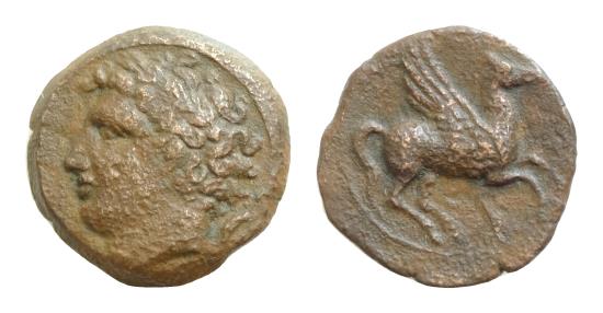 Sicily, Panormos as Ziz, c. 336-330 BC. Æ (14mm, 2.9g). Laureate head of Apollo l.; dolphin behind. R/ Pegasos flying r. CNS I, 9; SNG ANS -; HGC 2, 1060. Rare, VF