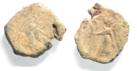 Nabataean kings. Time of Aretas IV (9 BC-AD 40). Lead tessera (16mm, 3.21g). Head of Athena r. wearing crested helmet / Nike standing l. hilding wreath. Hoover, Category I, Group A (same obverse die).